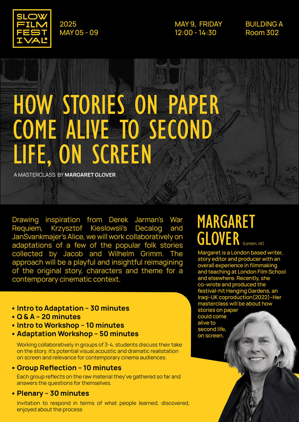 12:00–14:00 – HOGYAN KEL ÉLETRE AZ IRODALOM FILMVÁSZNON Mesterkurzus: Margaret Glover (UK) – Az előadás Grimm-mesék és helyzetgyakorlatok segítségével vezeti be a részvevőket a történetek dramatizálásának műhelytitkaiba. Helyszín: 302-es terem, A épület, 2. emelet (angol nyelven – korlátozott férőhely, regisztráció ajánlott)