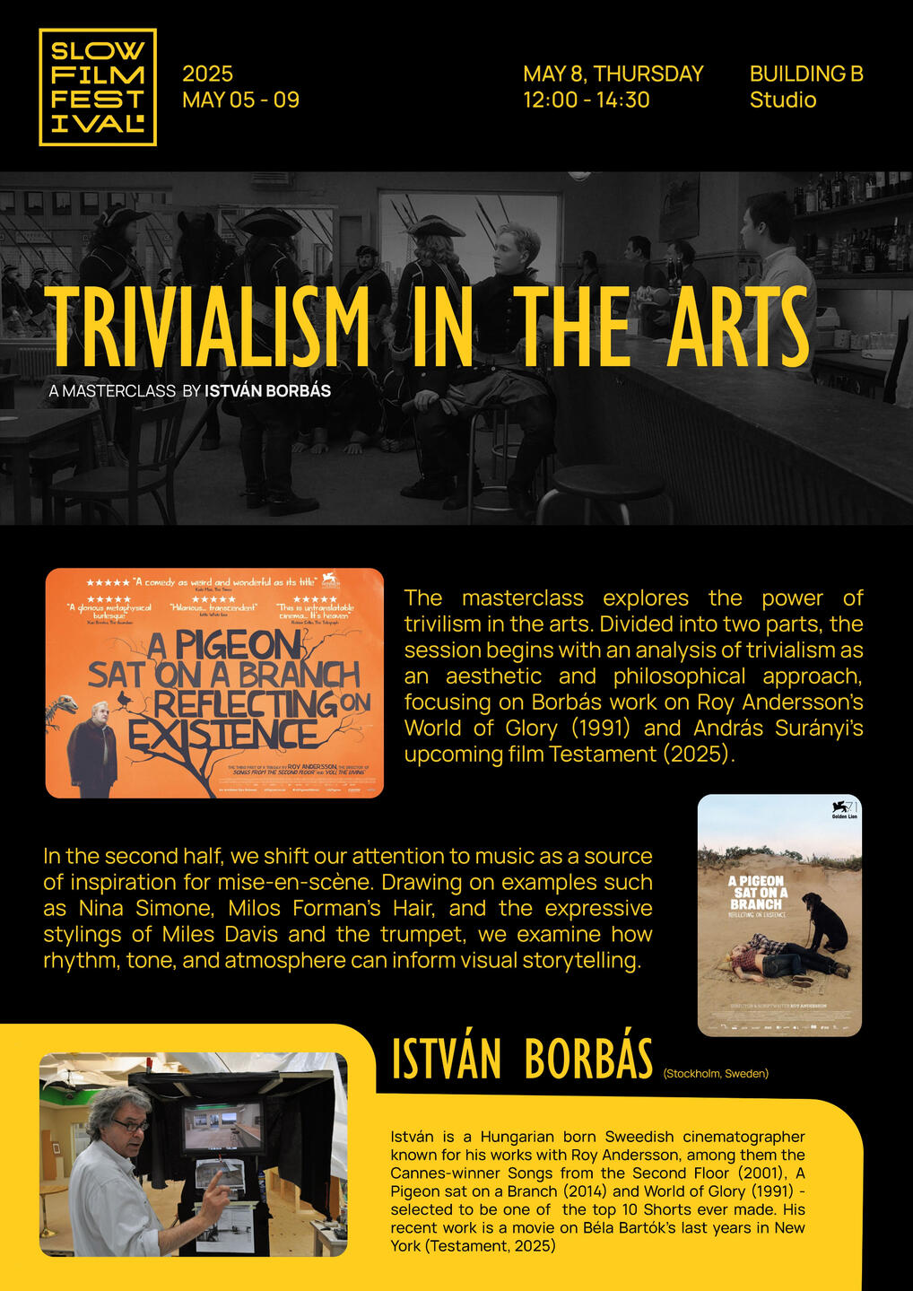 12.00-13.30 – TRIVIALISM IN THE ARTS – Masterclass by István Borbás, SFF, HCA on trivialism and radicalism in visual storytelling. – Studio Room, Building B (In English - limited places, registration recommended).