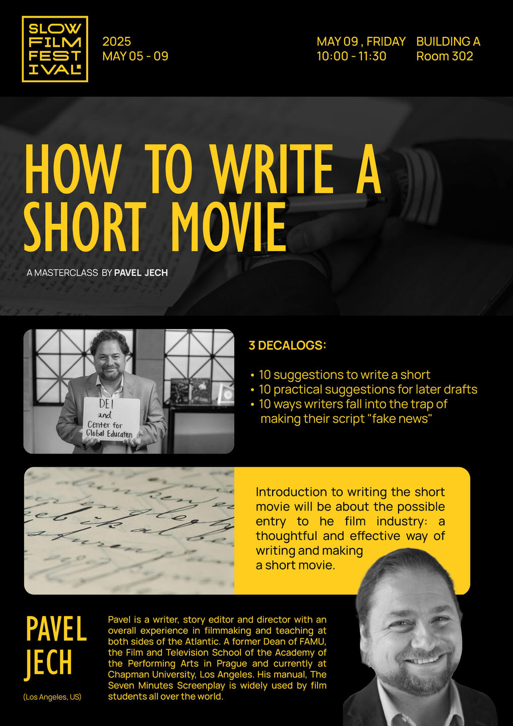 10.00-11.30 – SCREENWRITING FOR THE SHORTS – Masterclass by Pavel Jech on the special focus and technique of writing for a short movie. (In English – limited places, registration recommended). – Room 302, Building A Second Floor.